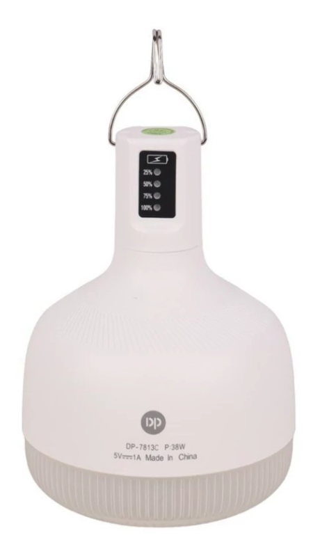 لامپ آویزدار شارژی DP.LED Light DP-7813C 38W لامپ آویزی قابل حمل شارژی دی پی مدل DP-7813C با توان خروجی 38 وات مجهز به 5 حالت نوردهی فوق قوی، قوی، کم نور، چشمک زن و SOS با رنگ نور مهتابی، شدت جریان ورودی 1 آمپر در 5 ولت با توان 38 وات لامپ از نوع استوانه ای ساخته شده از جنس پلاستیک باکیفیت، مقاوم در برابر آسیب های فیزیکی احتمالی همچون فشار،ضربه و ضدآب