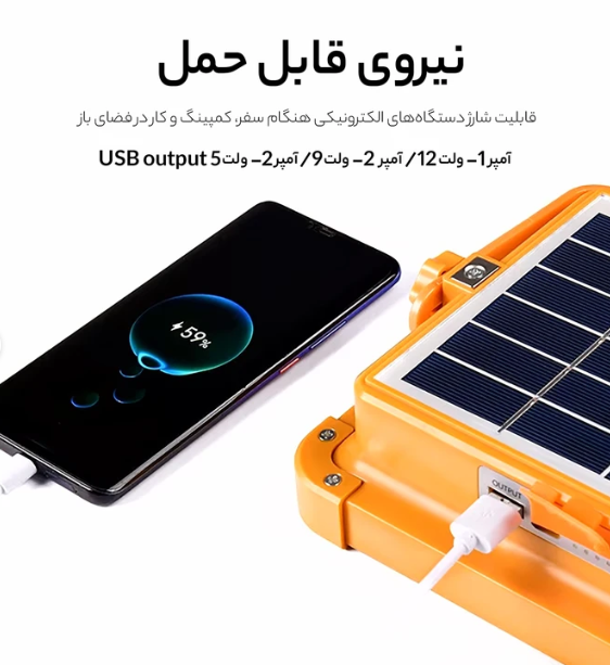 تأمین انرژی این چراغقوه از طریق باتری داخلی قابلشارژ توسط پورت USB همراه با پنل خورشیدی است که بهراحتی در صورت نبود برق باانرژی خورشیدی شارژ میشود.